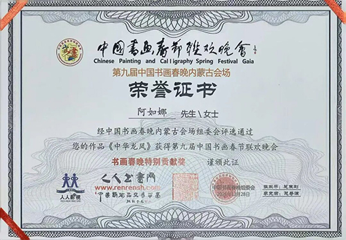 “翰墨飘香凝文脉,丹青溢彩耀北疆。”2025年12月29日,第九届中国书画春晚内蒙古分会场的舞台上,一曲《中华龙凤》声动全场——歌唱家阿如娜以澄澈婉转的嗓音,将中华传统文化的厚重与北疆草原的辽阔熔铸于旋律之中,不仅斩获“书画春晚特别贡献奖”,更被授予“第九届书画春节联欢晚会内蒙古会场春晚形象大使”荣誉。