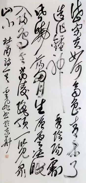 站在文化传承的维度审视,孟云飞的艺术实践恰似一座桥梁:一端连着甲骨青铜的文明密码,一端通向数字时代的审美重构;一面是“二王”帖学的文脉延续,一面是碑学雄强的当代诠释。其作品不仅因笔墨精妙,更因其承载着以书载道的文化自觉。在键盘取代毛笔的今天,这位兼具学者深度与侠者气度的书法家,正以纸为疆、以墨为马,书写着属于这个时代的兰亭新序。正如其自题诗云:“铁画银钩藏雅韵,粗微浓淡漫馨香。群龙墨海翻飞浪,羡煞雏鸭翼欲张。”此中气象,岂非中华文化生生不息之缩影!?然而他自己却说:“翰墨之道,渊深似海,余虽浸淫数十年,不过略窥门径而已。昔年临池学书,常感前贤笔意精微处,犹隔云山万重。每观前贤法帖,始知艺境无穷而人力有尽。近岁愈觉艺途漫漫,譬如登山者仰见嵯峨,虽勉力攀援,终在半途。惟以澄怀观道之心,朝干夕惕,庶几不负古人遗法。艺海无涯,余惟秉烛而行耳!”