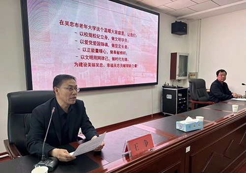 活动中,吴忠市关工委副主任彭健以“银发丹心守初心乐学有为展风采”为题,系统解读党的二十届四中全会、全国两会精神,重点围绕民生保障、老年服务等部署要求,结合老年大学实际,从严守校规校纪、厚植爱党爱国情怀、释放银发正能量、规范网络言行四个方面,引导学员争做新时代文明长者、合格学员,为老年大学发展建言献策。