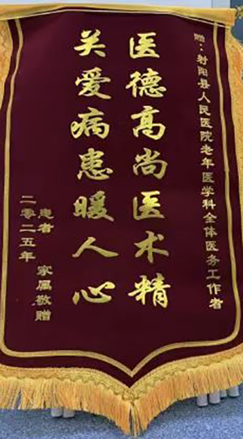 近日,一面镌刻 “医德高尚医术精,关爱病患暖人心” 的锦旗,被 92 岁高龄老人的家属郑重送到江苏省盐城市射阳县人民医院老年医学科。这面红彤彤的锦旗,不仅承载着家属对医护人员的满心感激,更映照出科室团队用专业与温情守护老年患者健康的初心。